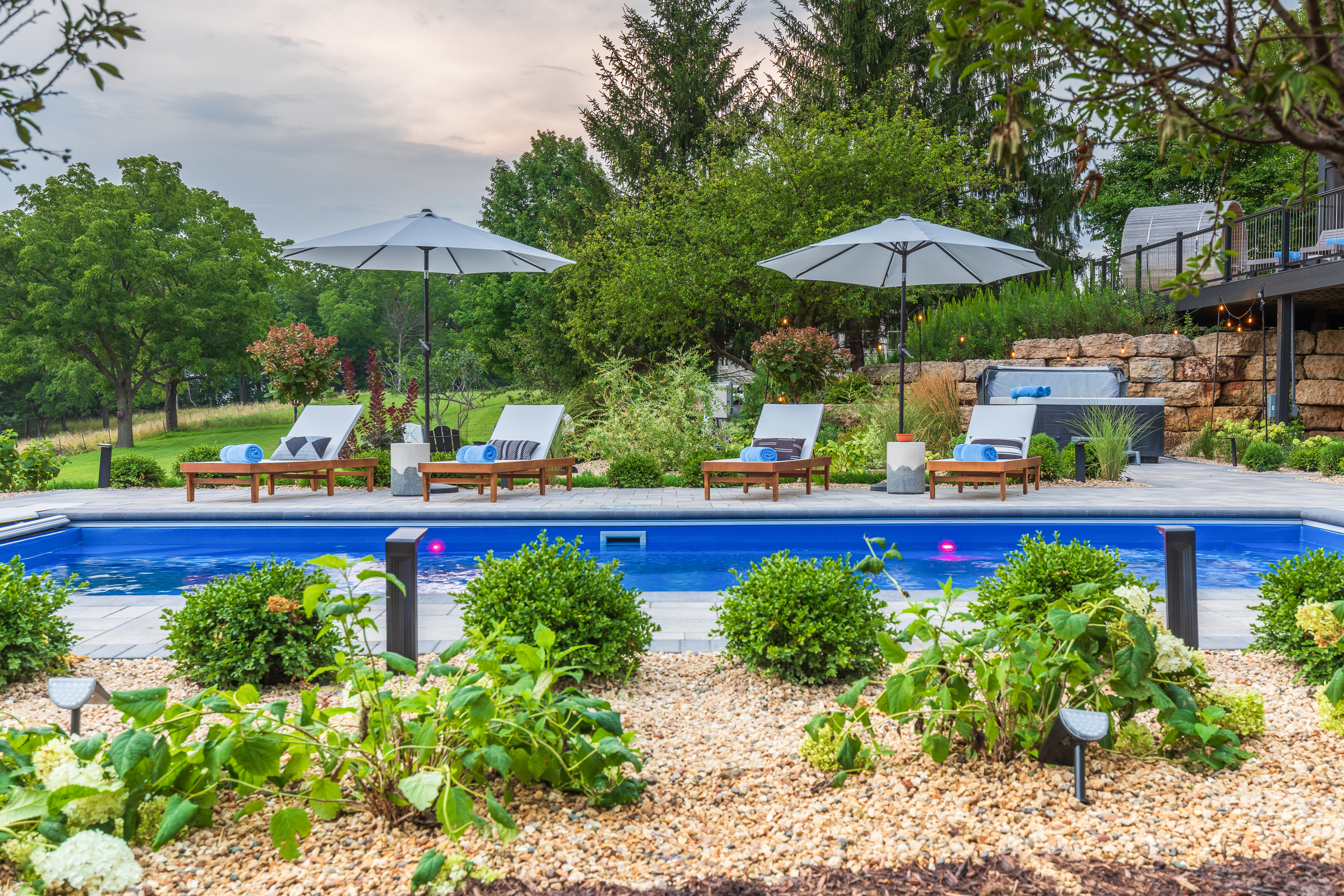 Resort-style outdoor living + sunset dining